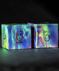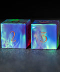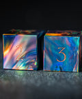 Each die reveals smooth gradients of violet, teal, emerald, and golden fire that shift with every tilt, giving the set a gemstone-like sense of depth and motion.