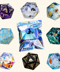 - Wird mit den folgenden Würfeln geliefert: D4, D6, D8, D10, D%, D12 und D20 (mit normalen Zahlen oder Logos auf den Würfeln)